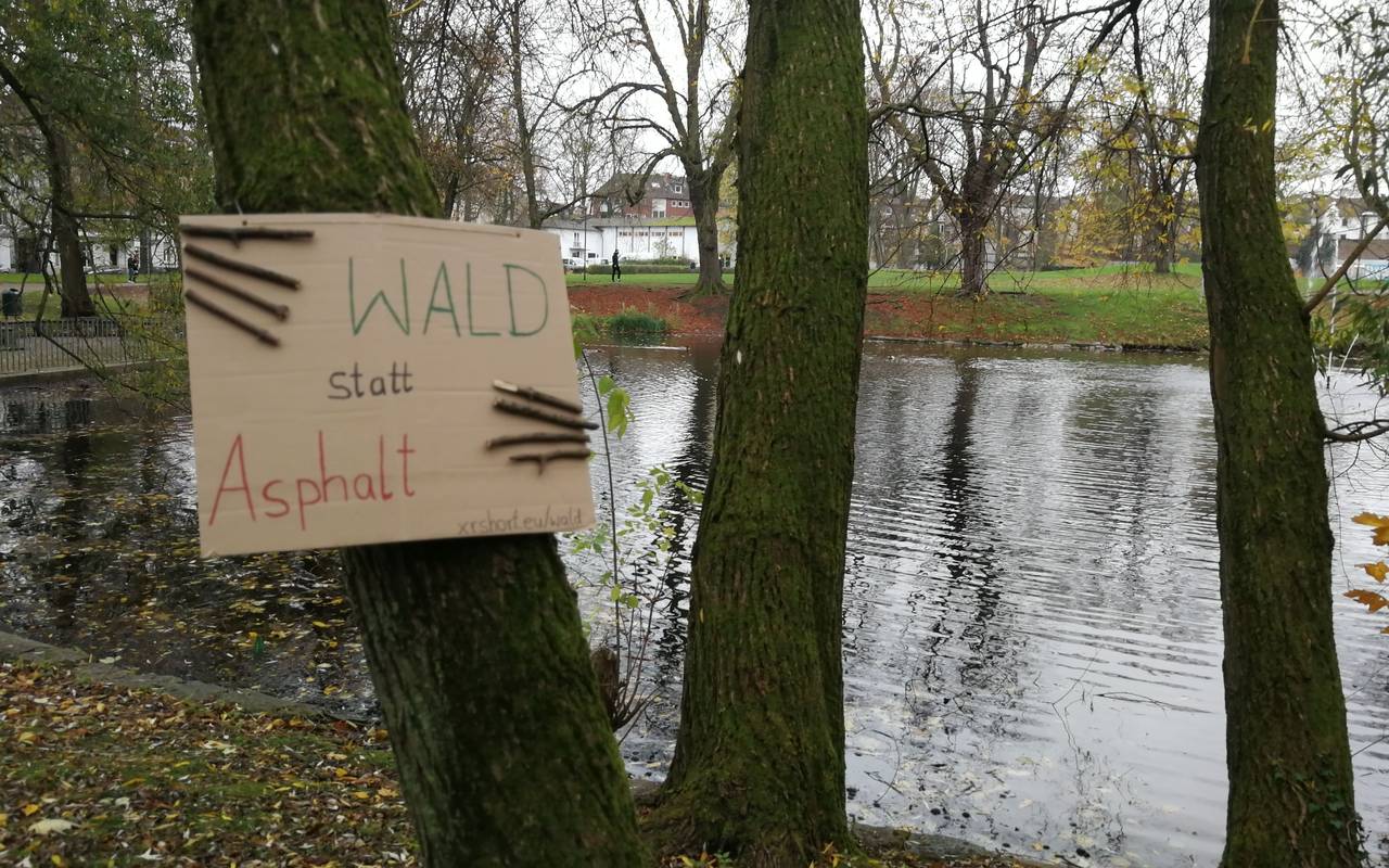 An Bäumen in und um Aachens Innenstadt sind seit Dienstagabend Schilder mit Botschaften befestigt worden - zum Beispiel am Münsterplatz und im Westpark.