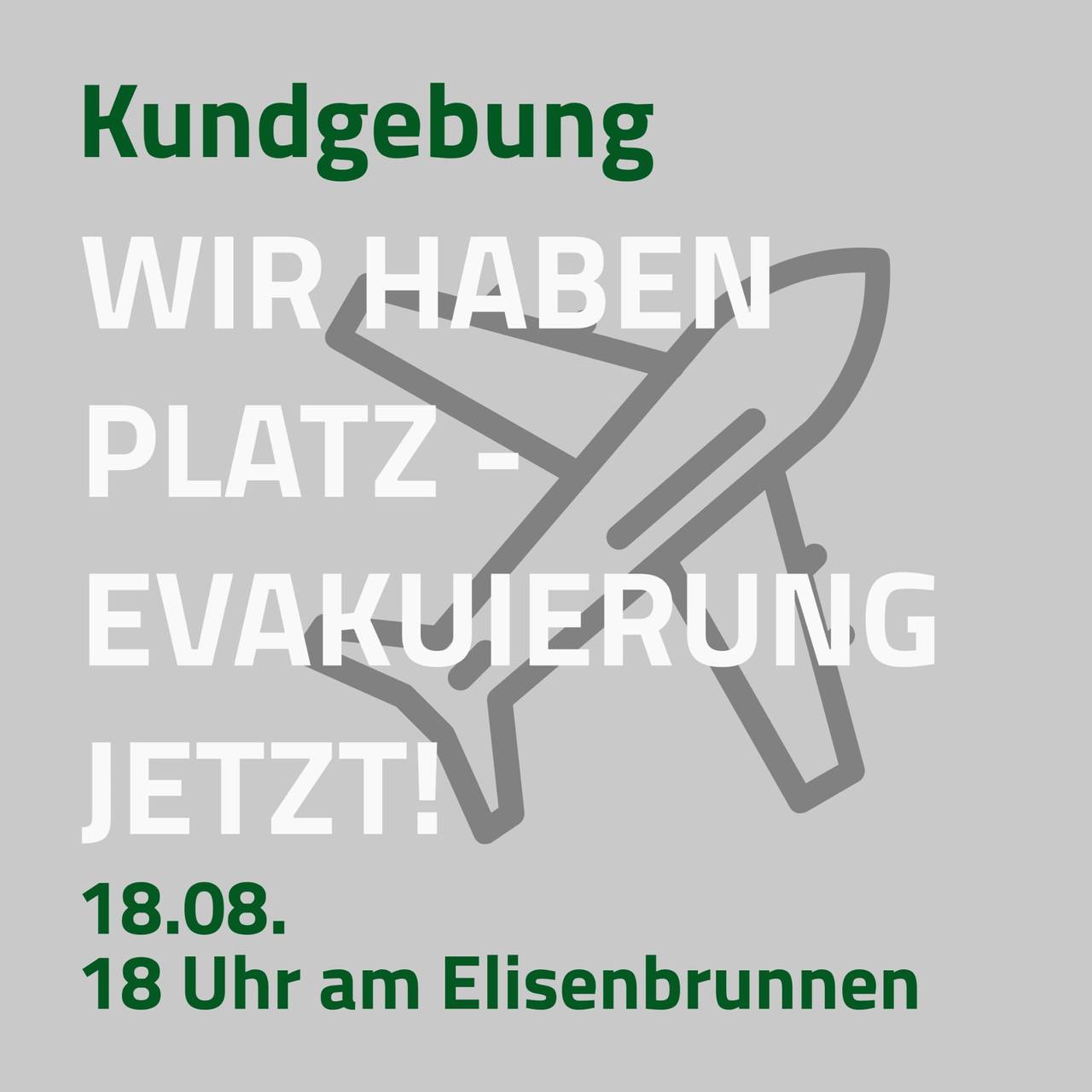 Die Veranstaltung mit dem Titel „Wir haben Platz – Evakuierung jetzt!“ beginnt um 18 Uhr am Elisenbrunnen.