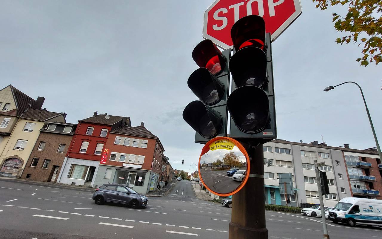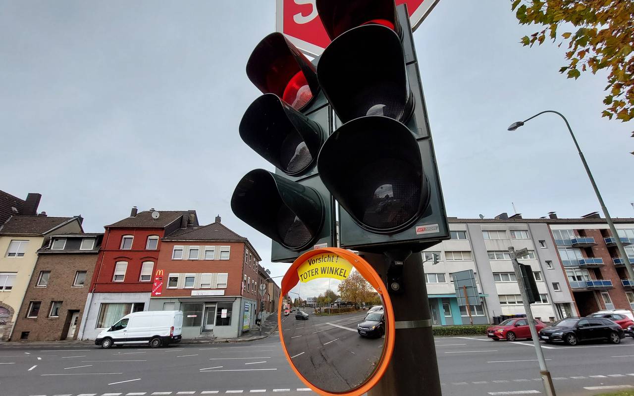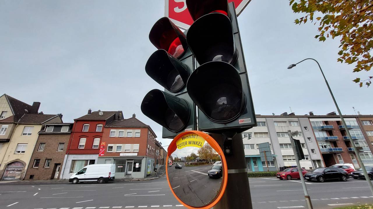 In Eschweiler werden jetzt an 23 Kreuzungen in der Innenstadt ohne baulich getrennte Radwege Trixi-Spiegel angebracht.